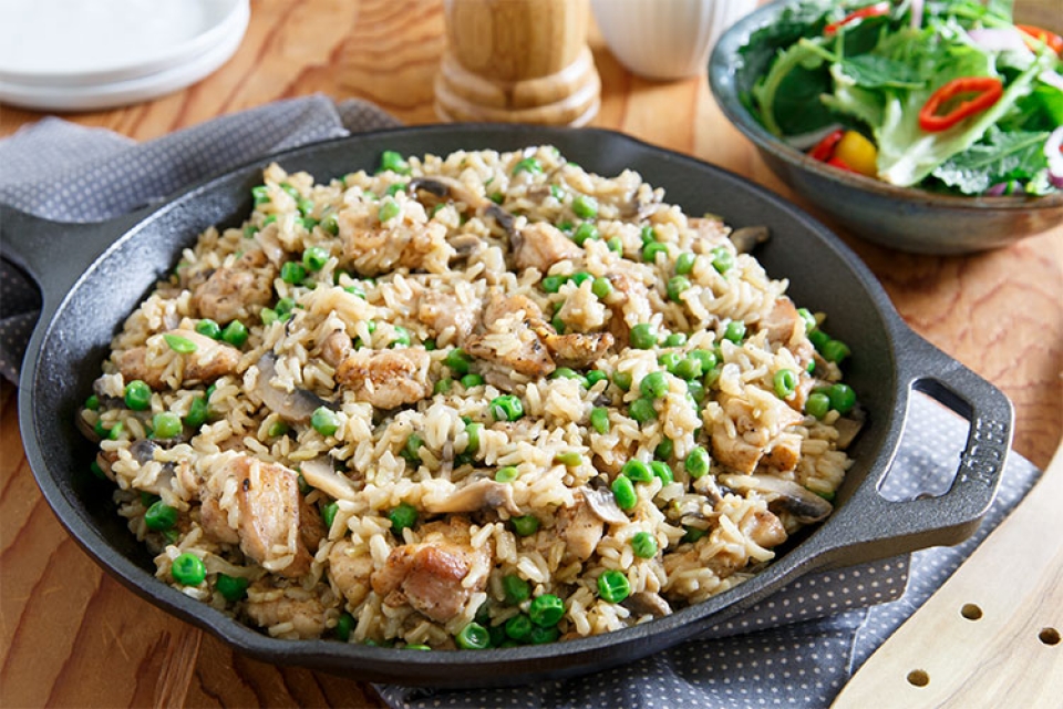 This one-pot meal is a savory delight. Mushrooms and chicken make a natural pair, and peas add texture and provide a good source of vitamins A, C and fiber.