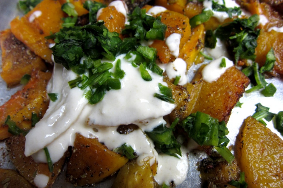 To serve, arrange warm butternut slices on a platter. Sprinkle lemon pieces liberally over the squash and then drizzle with the yogurt sauce. Scatter the chiles and the cilantro over the top and serve.